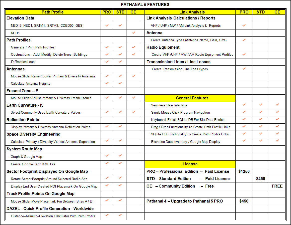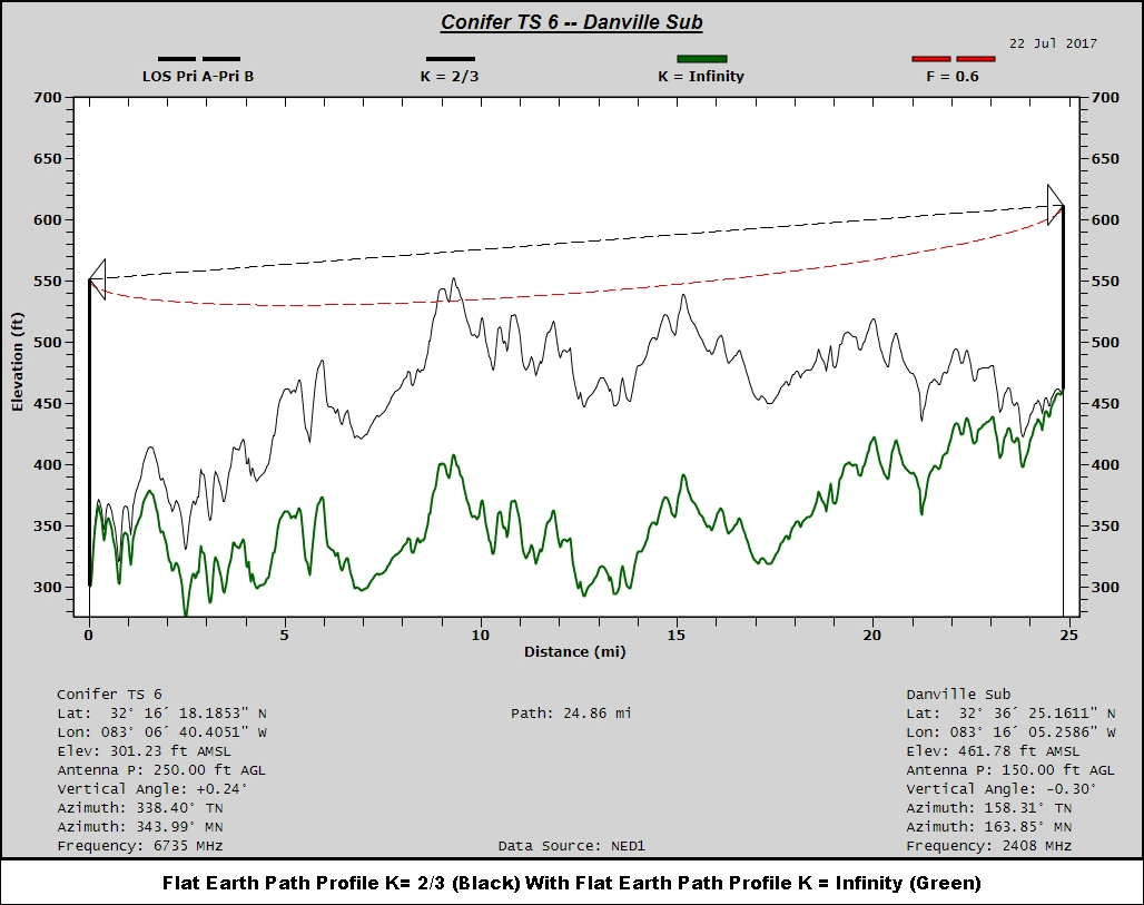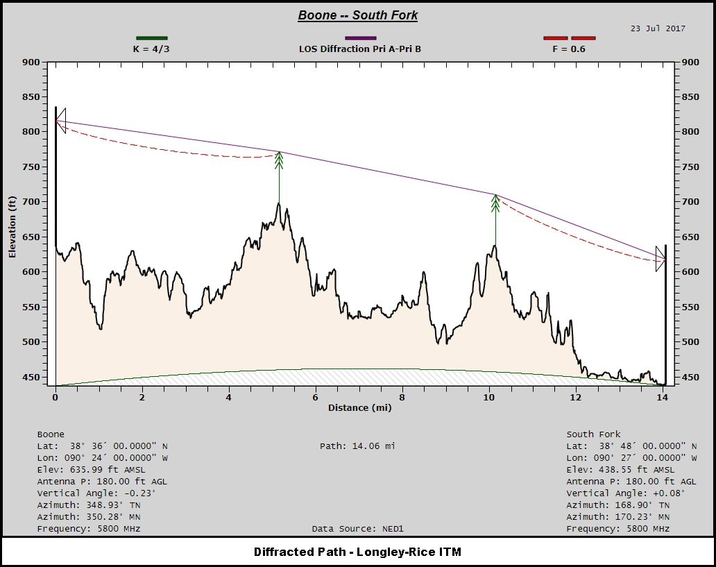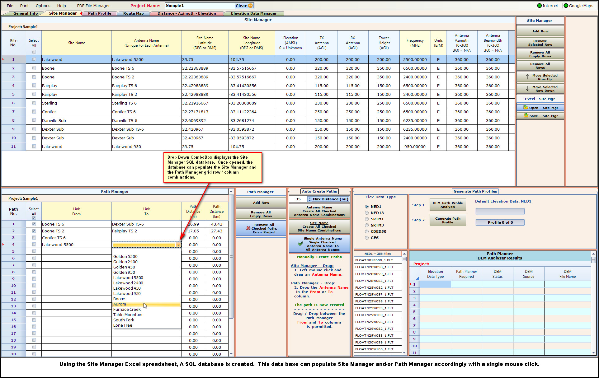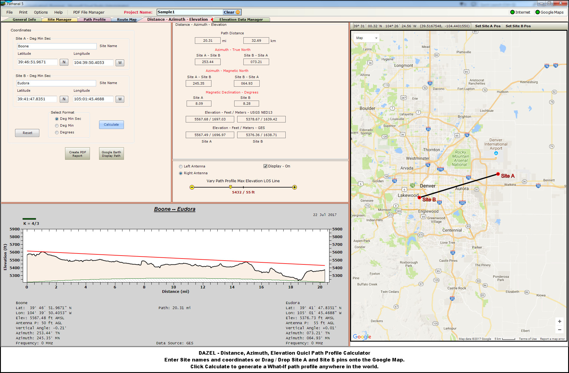 Path profiles can be generated with NED1/13, SRTM1/3, CDED50 (Canada) and Google Elevation Service (GES) data.