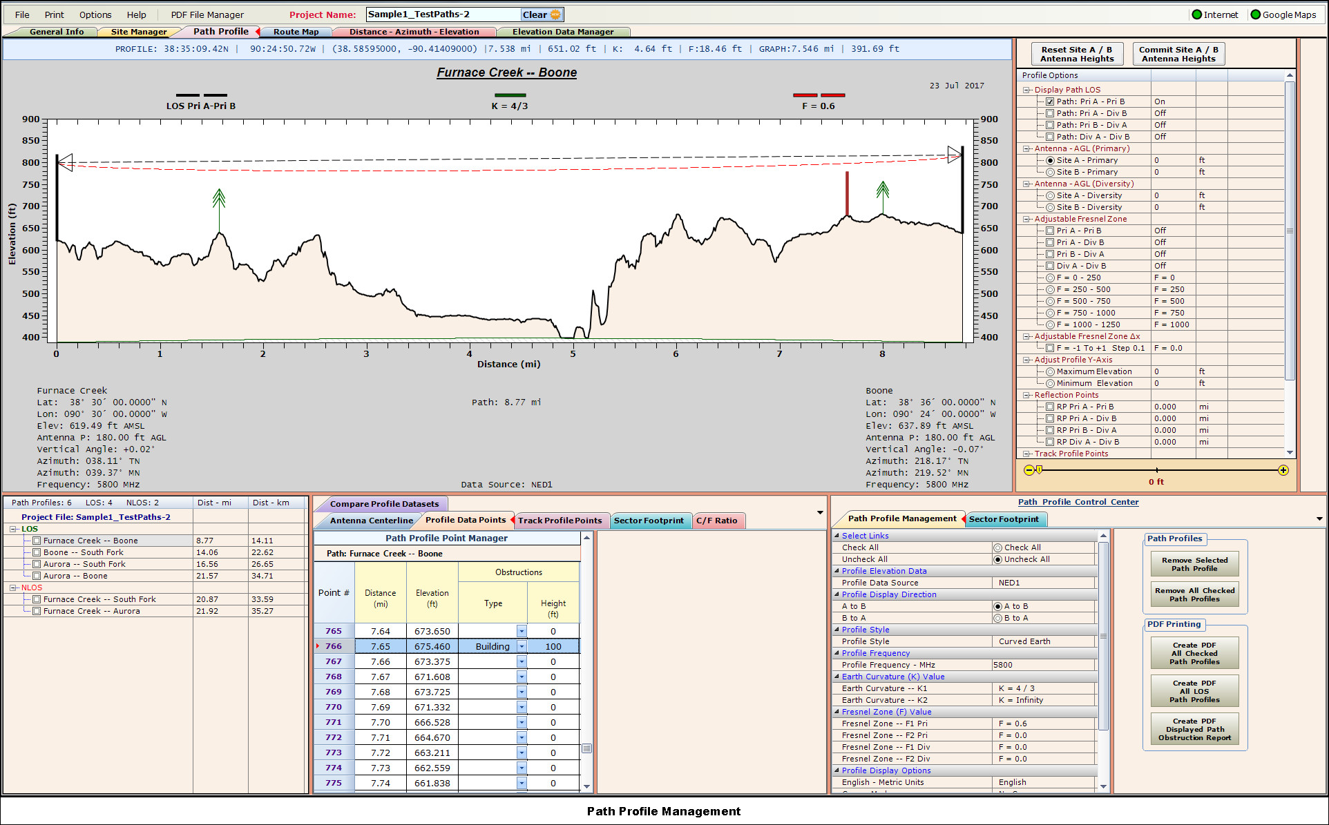 Path Profile ManagementManage path profiles points. Add building or tree obstructions.