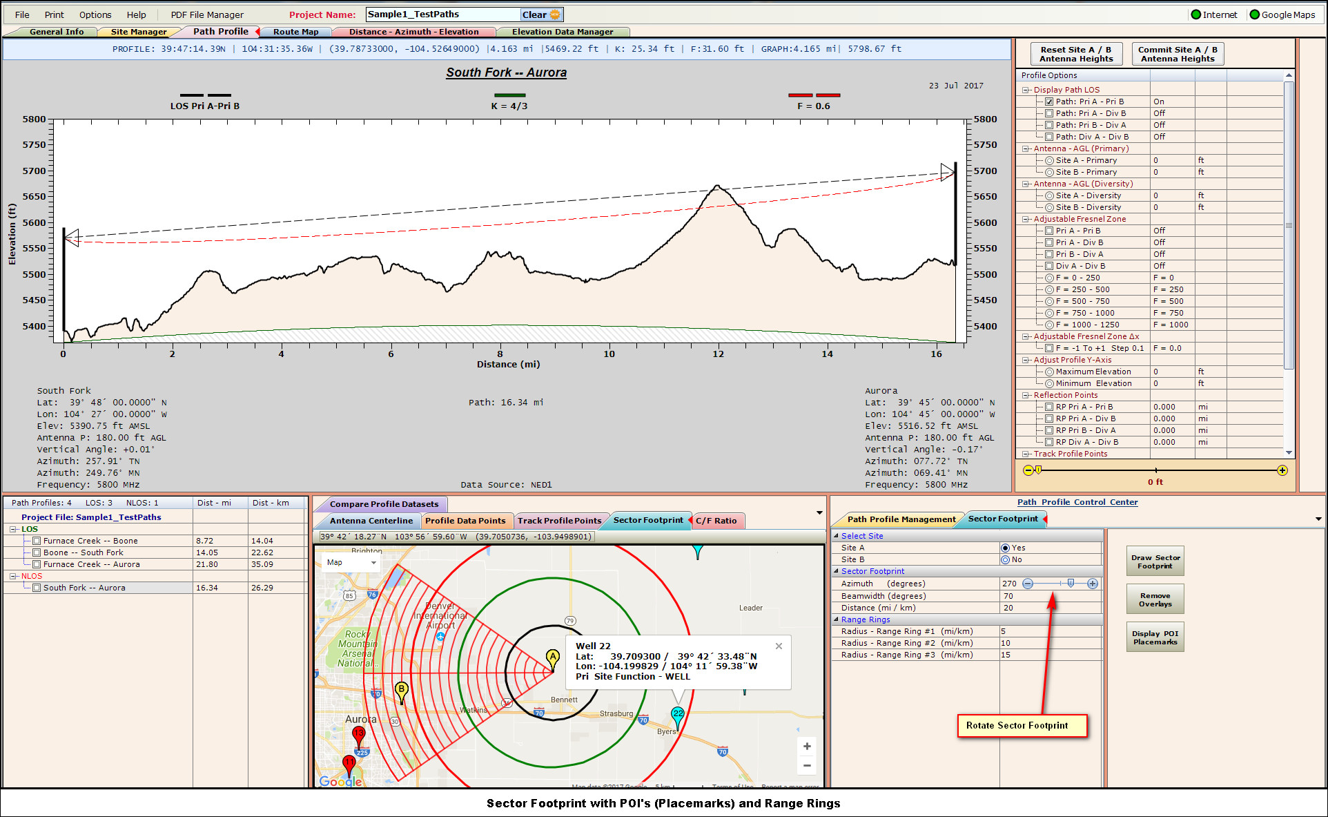 Display and rotate variable beamwidth sector footprints on Google Maps. POI's (Placemark Pins) can also be displayed.