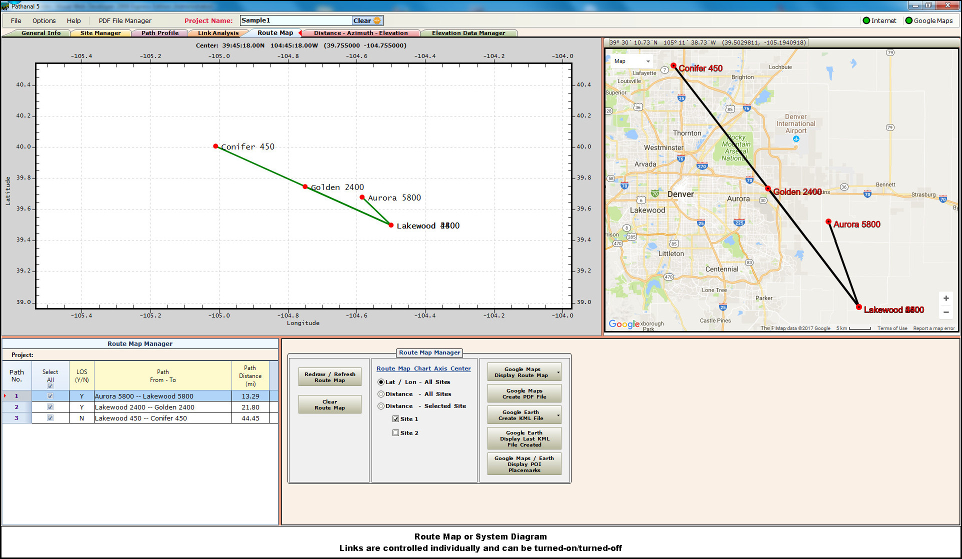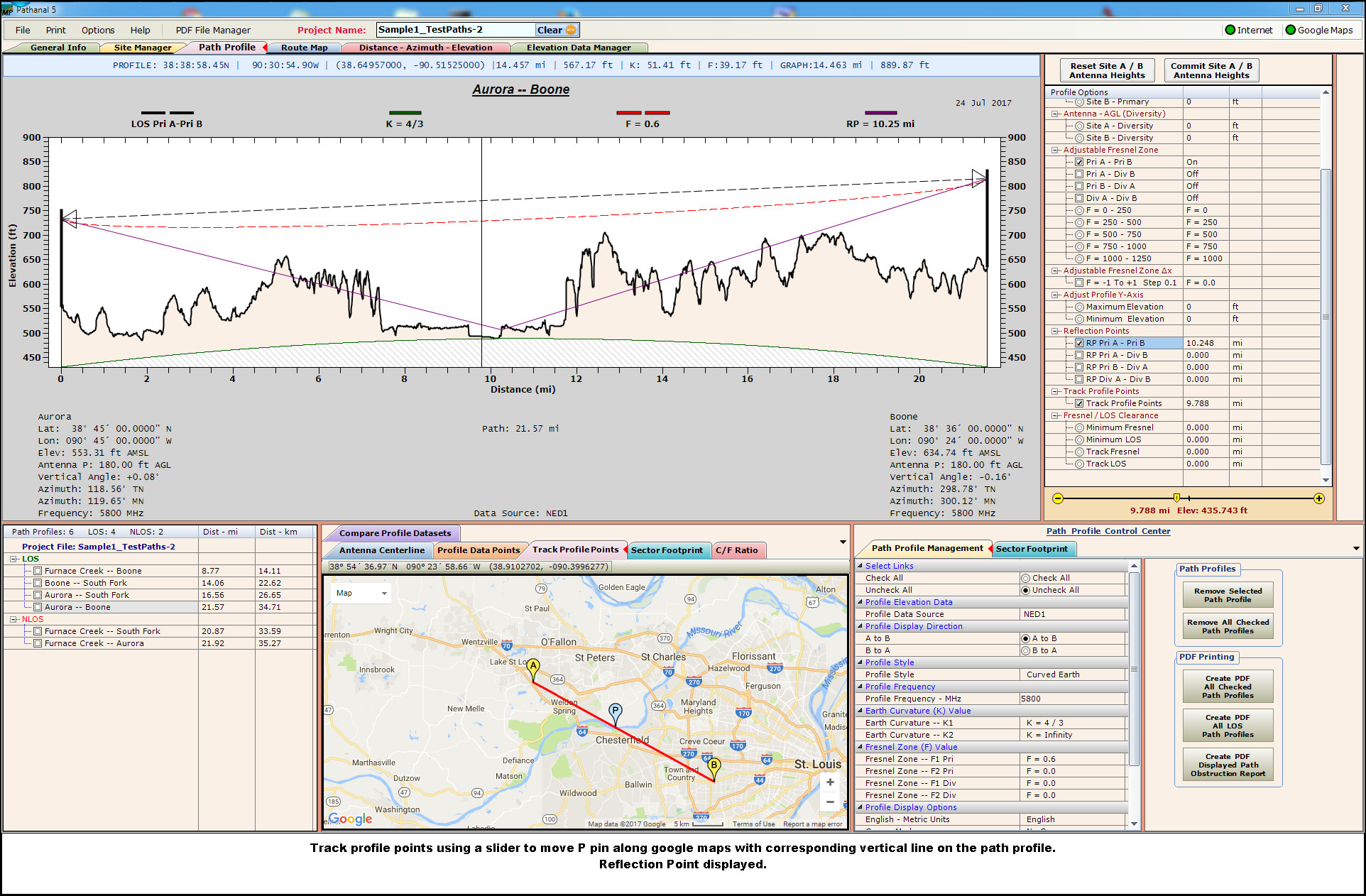 Route Maps displayed on white canvas, Google Maps, and Google Earth. Google Earth options to display Fresnel zone, path obstructions, path line clamped to ground.