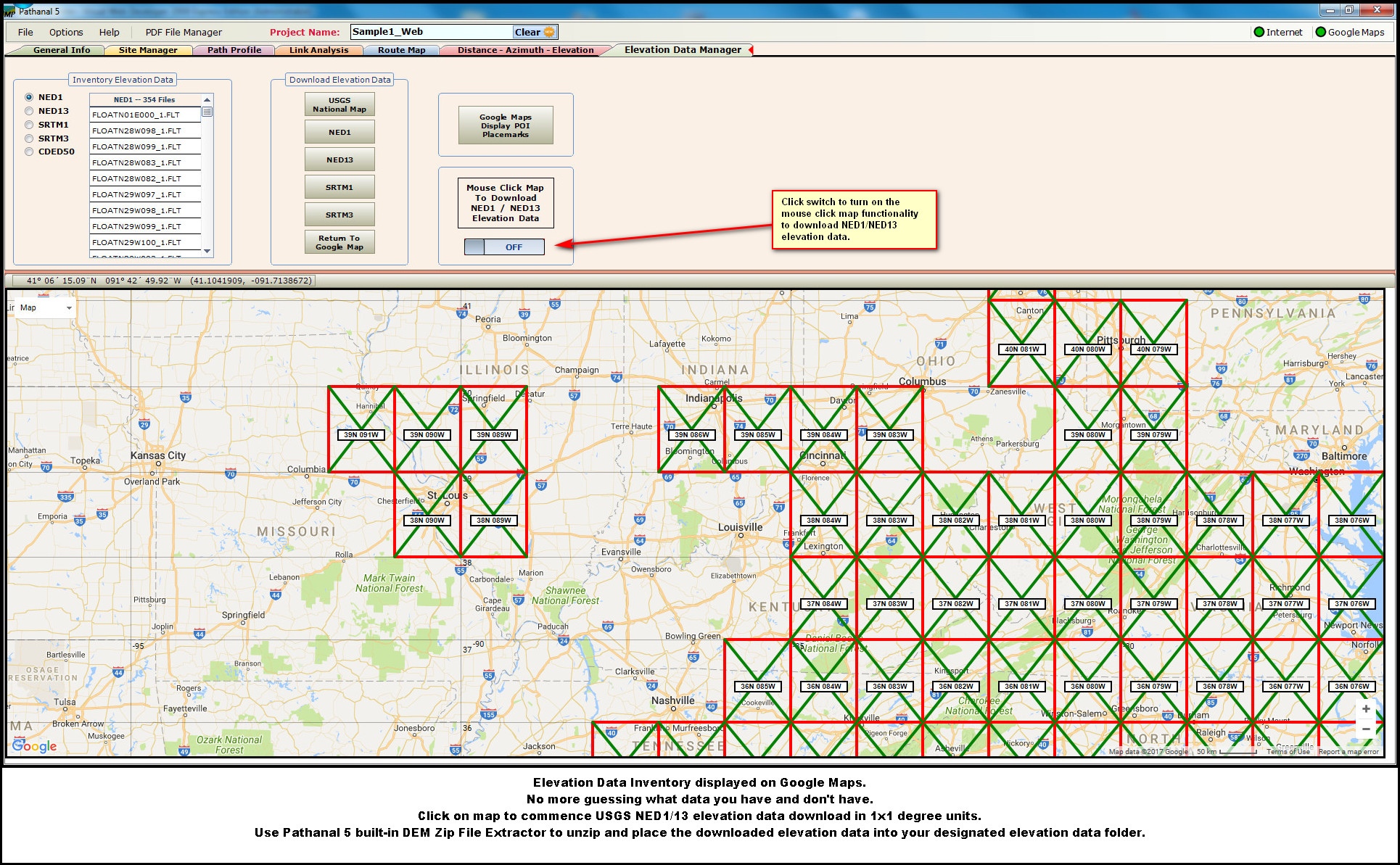Visual Elevation Data Inventory - Route Map / System DiagramsInventory of elevation data is displayed on Google Map. Click on Google Map to download USGS NED1/13 elevation data.