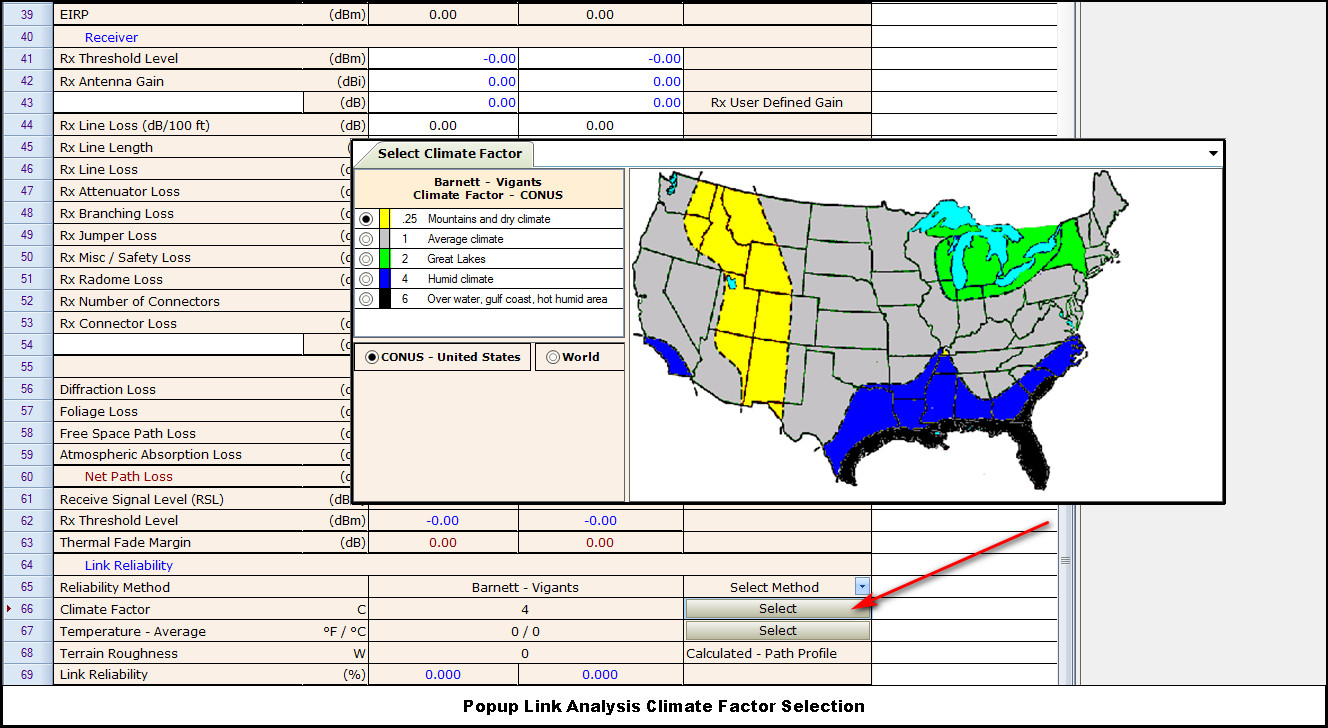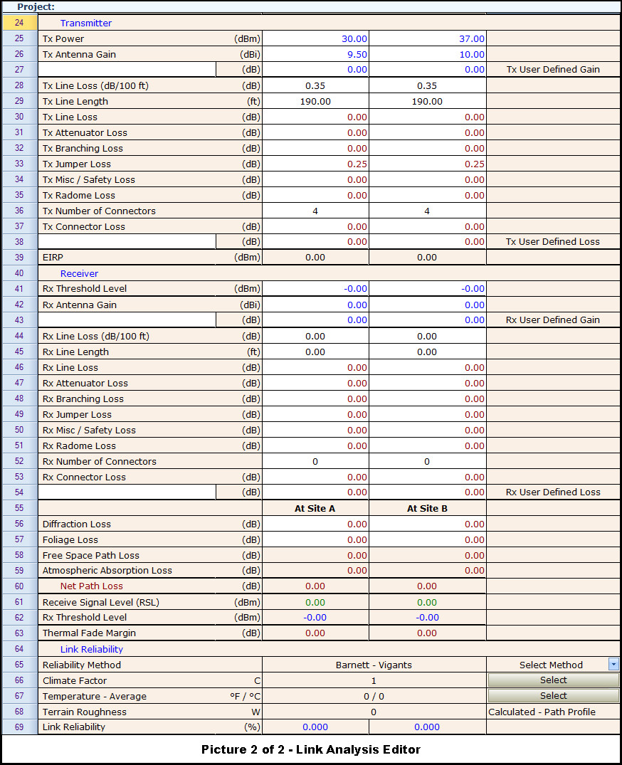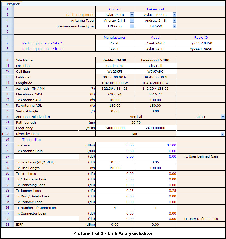 Link AnalysisThe Link Analysis editor imports the selected RadiantTxl equipment profiles, antenna types, and transmission line loss types.