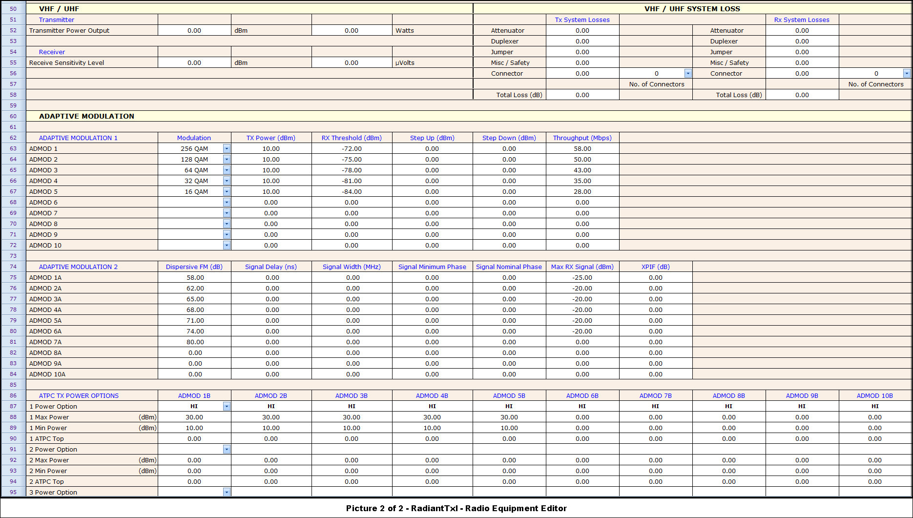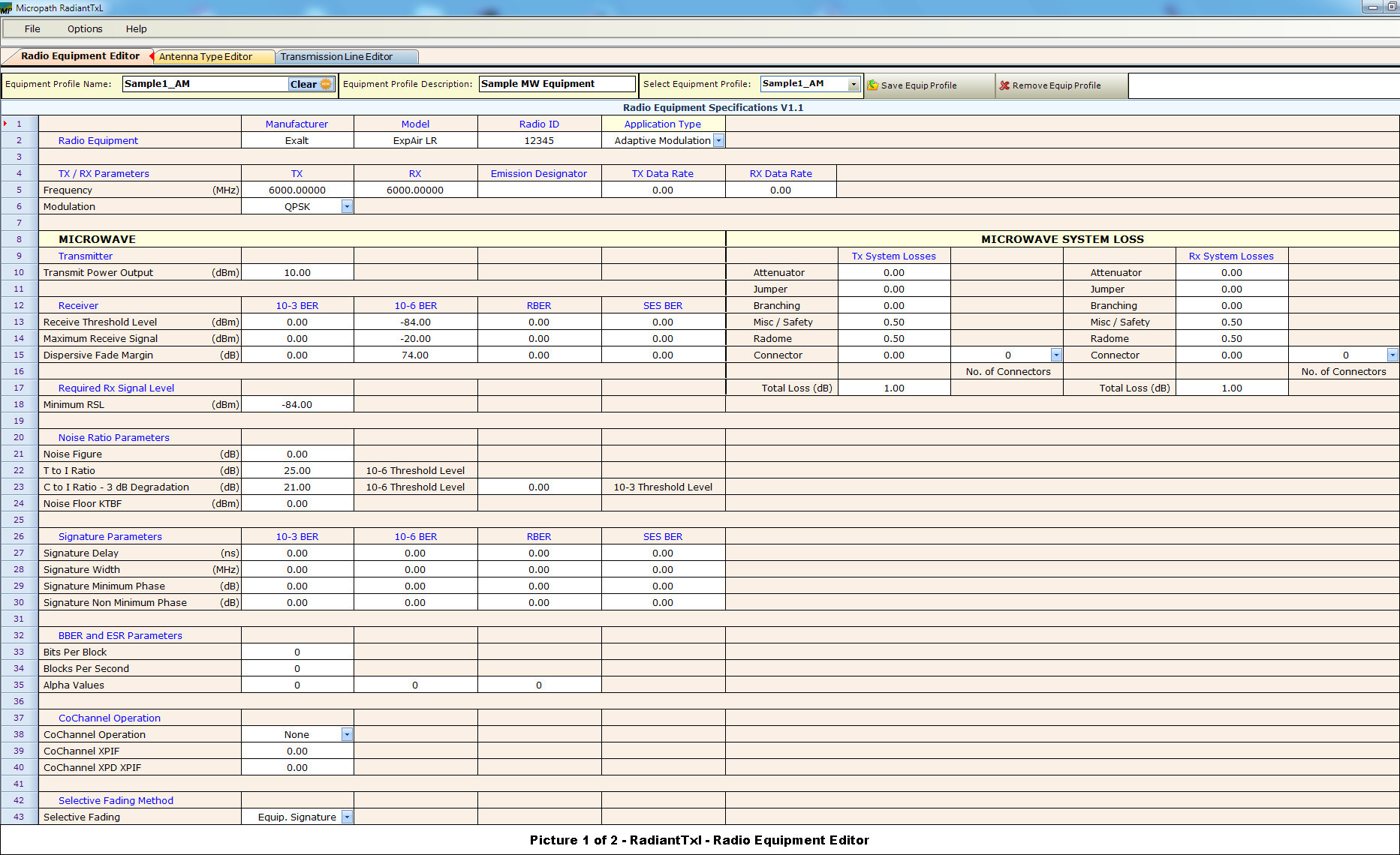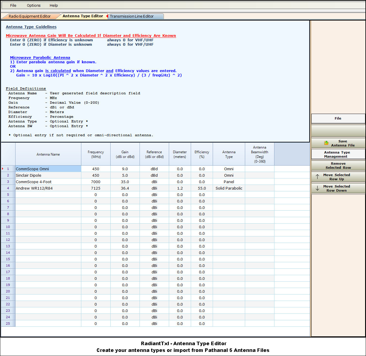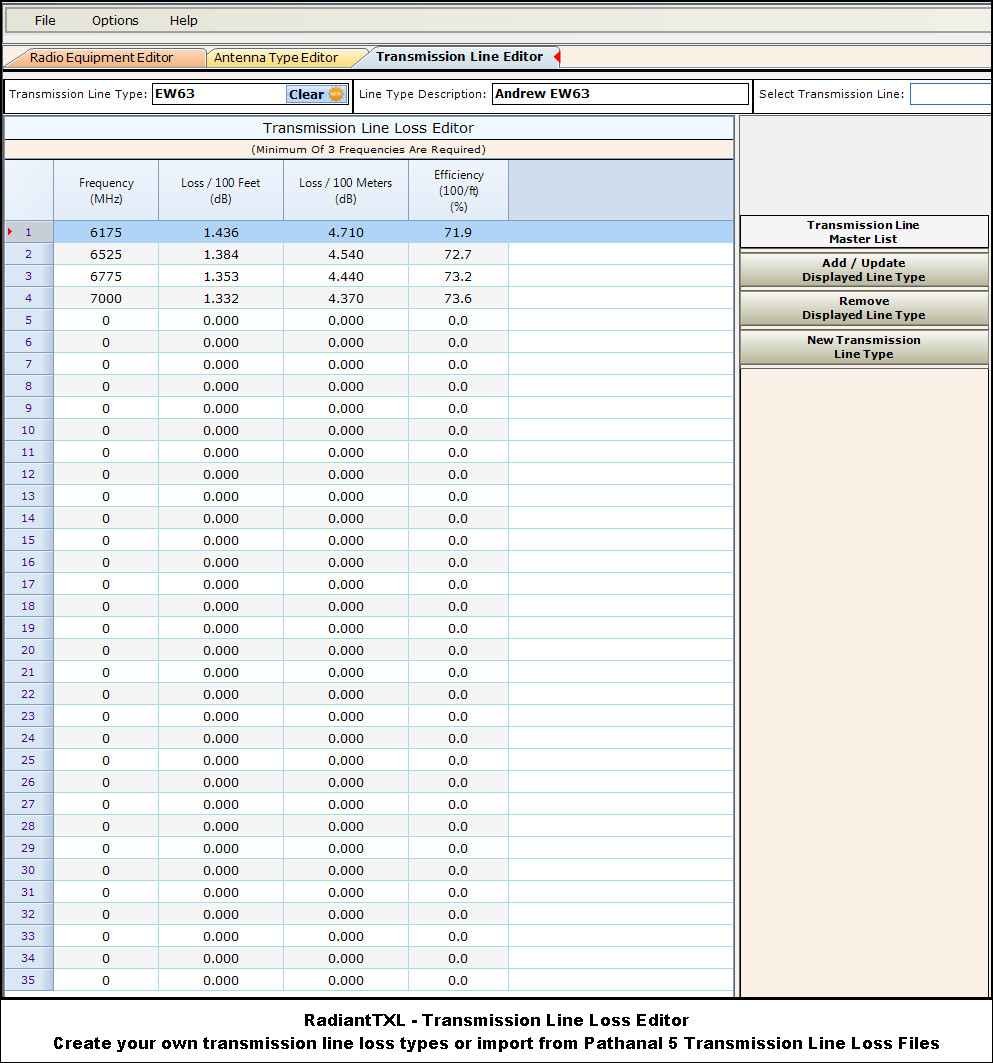 RadiantTXL - Radio Equipment Parameters, Antenna Types, And Tranmission Line Loss TypesCreate and import your own databases into the Path Analysis.